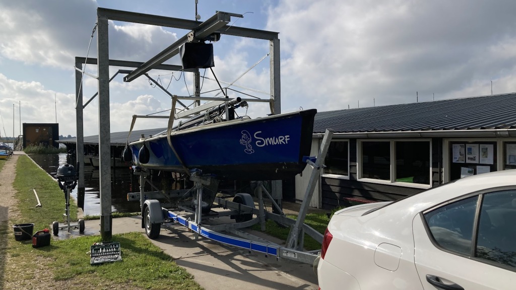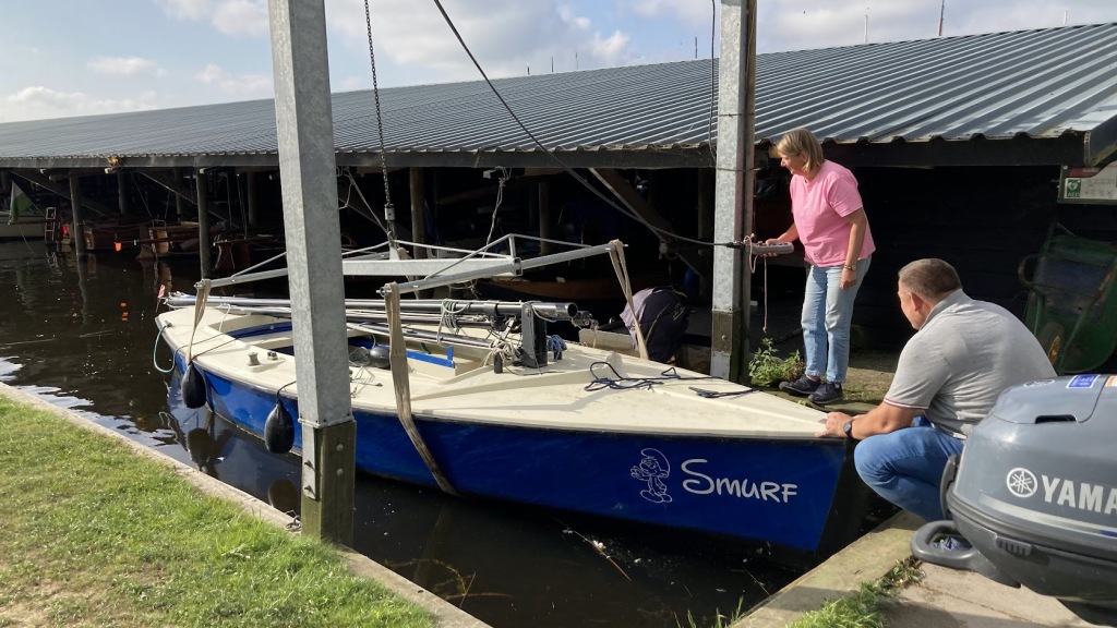 We maken even plaats voor de volgende en kunnen daarna in alle rust Smurf verder optuigen. Het motortje start meteen en loopt goed. Deze heeft een grote beurt gehad en is weer in top conditie. Wat die eigenlijk al wel was, maar onderhoudt is altijd goed.